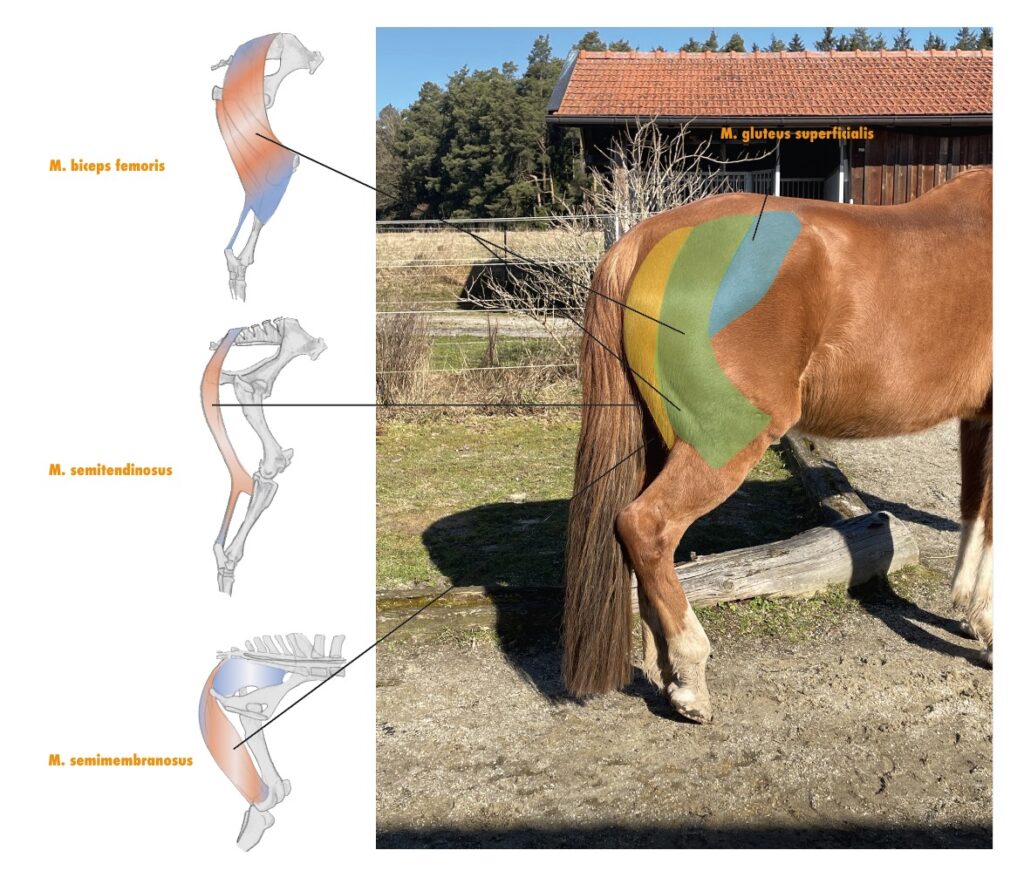 „Ohne Huf, kein Pferd“ bedeutet nicht nur, dass der Huf selbst gesund sein muss. Es geht auch um Faszien, Muskeln und die gesamte Bewegungsmechanik. Wenn der Innenfuss des Pferdes, der Huf und insbesondere die Trachten nicht korrekt belastet werden, gerät die hintere fasziale Armlinie unter Spannung – nicht nur am Bein, sondern im Rücken, zum Becken und bis zum Genick. Das Pferd kompensiert automatisch, oft unbemerkt, und nimmt eine dauerhafte Schonhaltung ein.